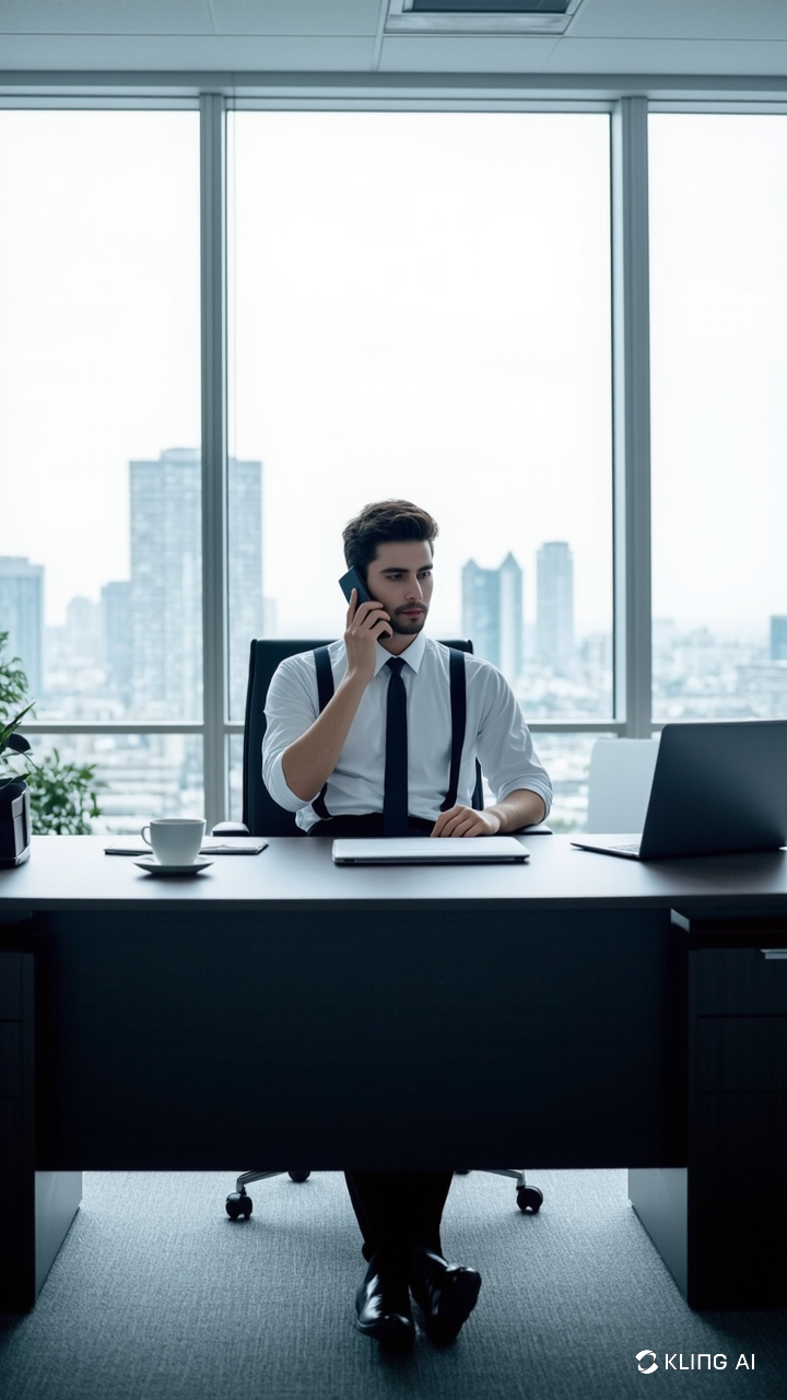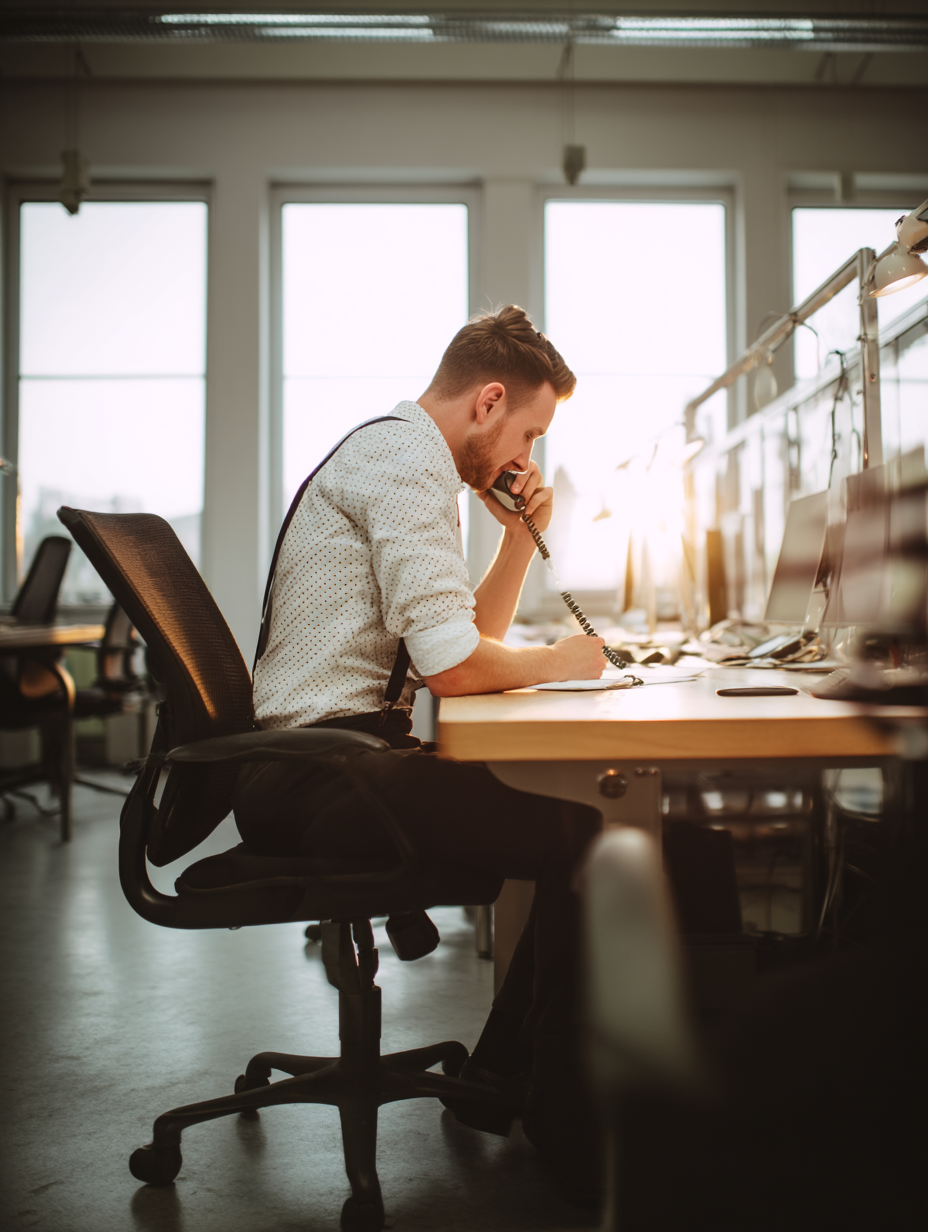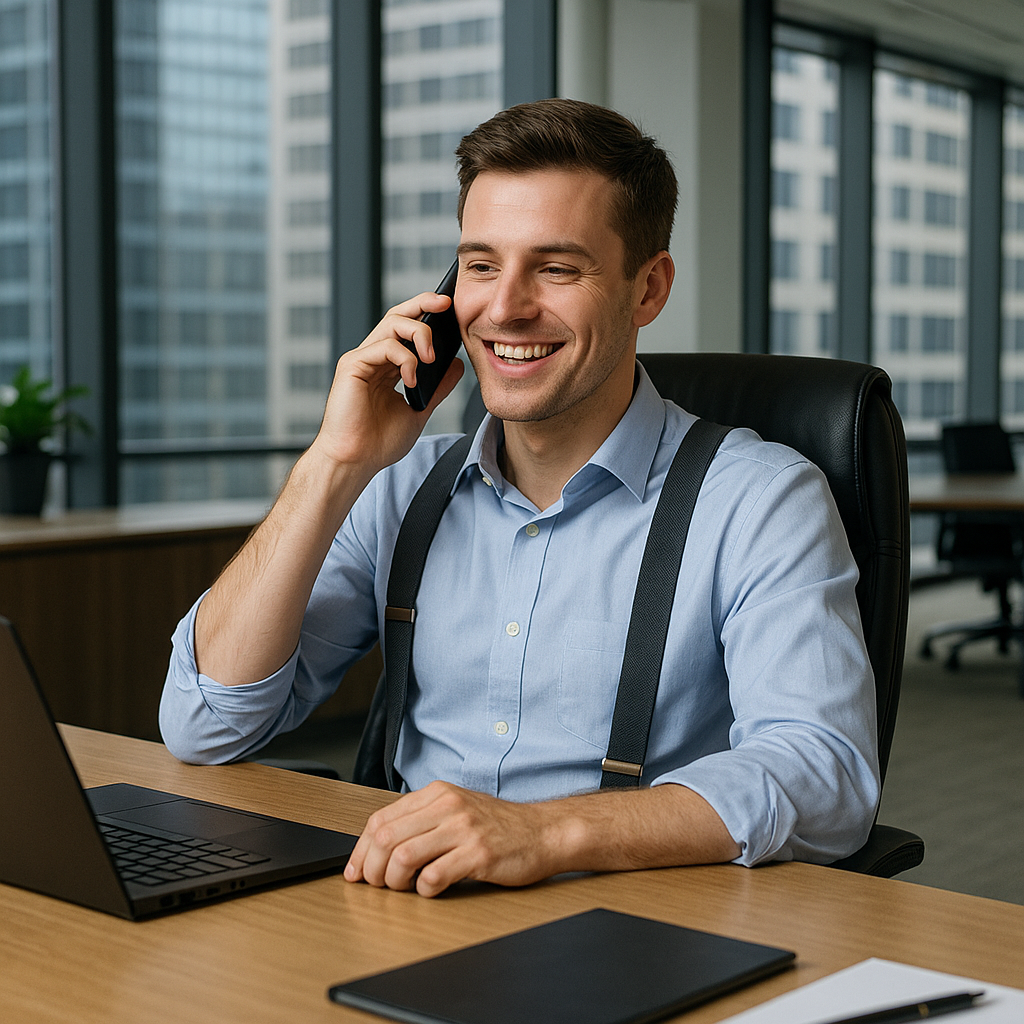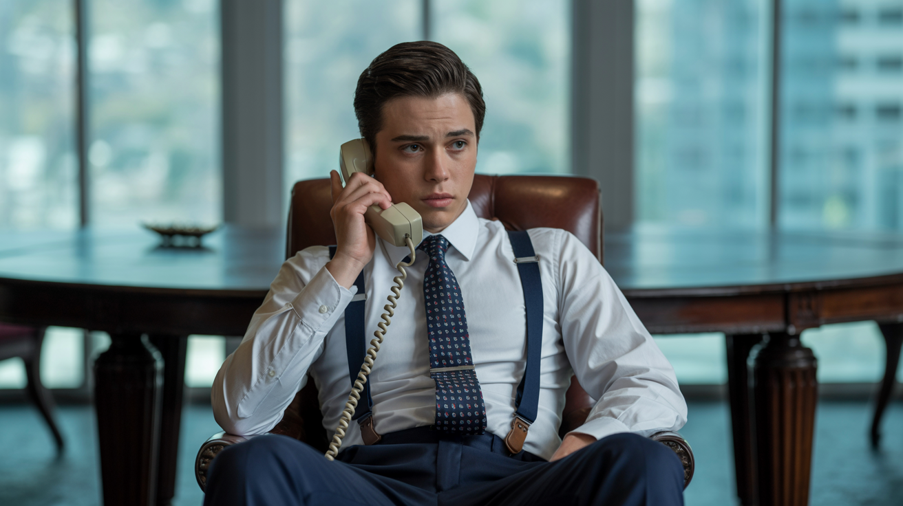 A picture of a young man in a shirt and suspenders talking on the phone in an office chair behind a large table, in his office, it is a large office in a large company