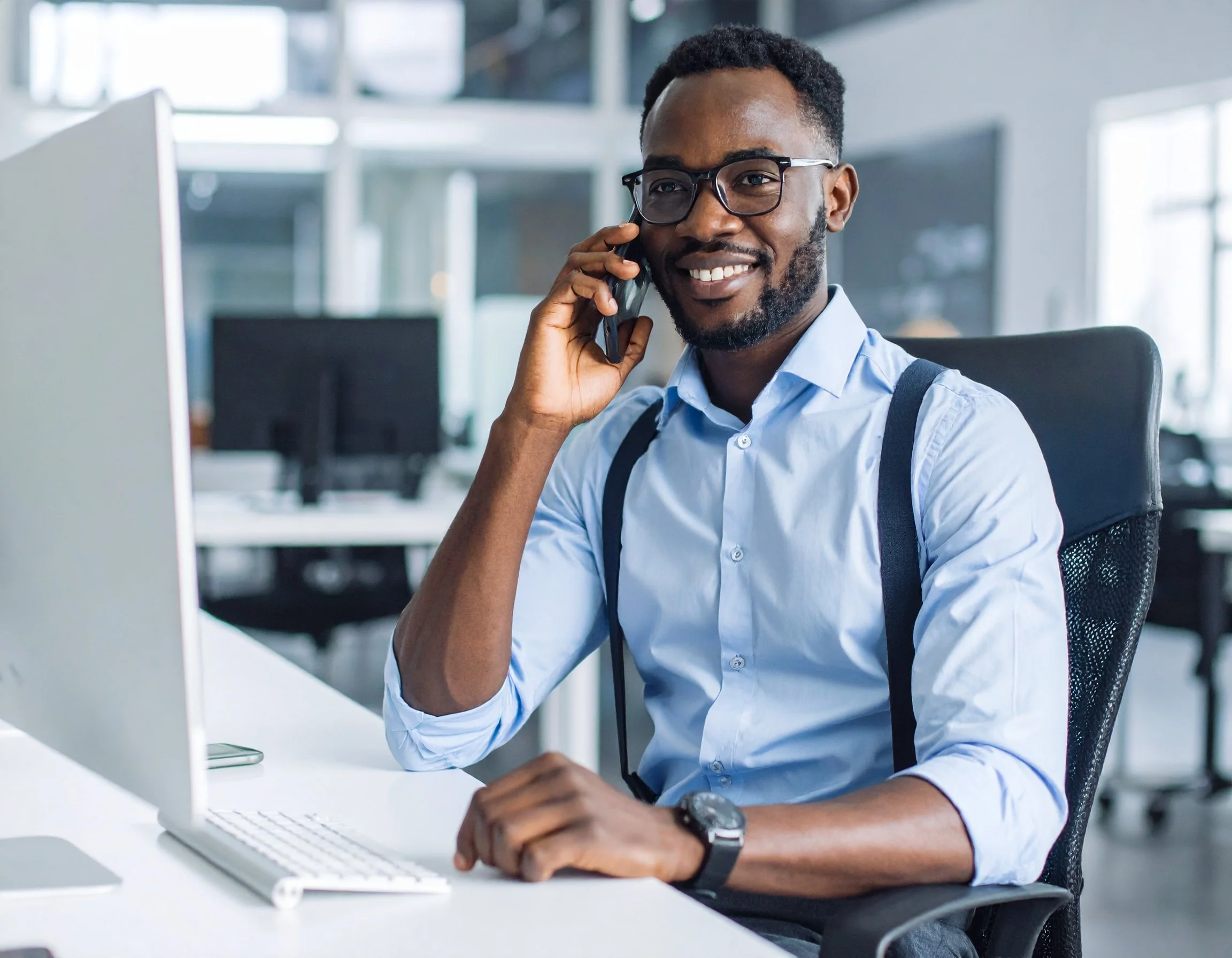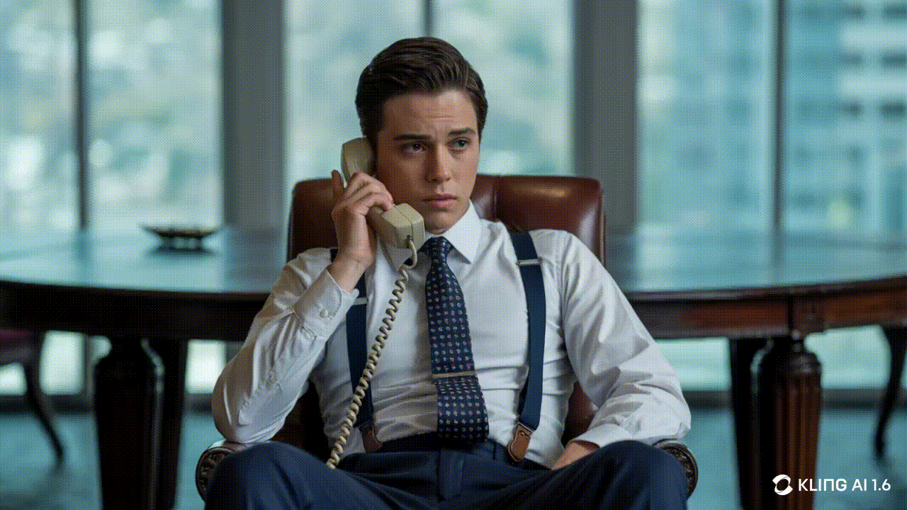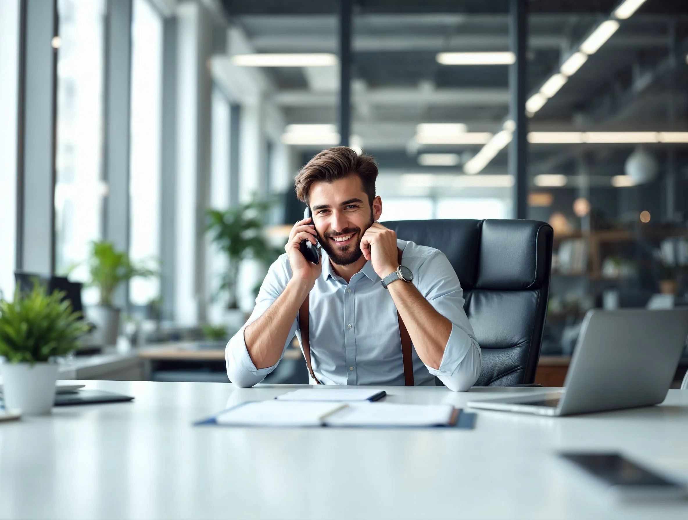 A picture of a young man in a shirt and suspenders talking on the phone in an office chair behind a large table, in his office, it is a large office in a large company