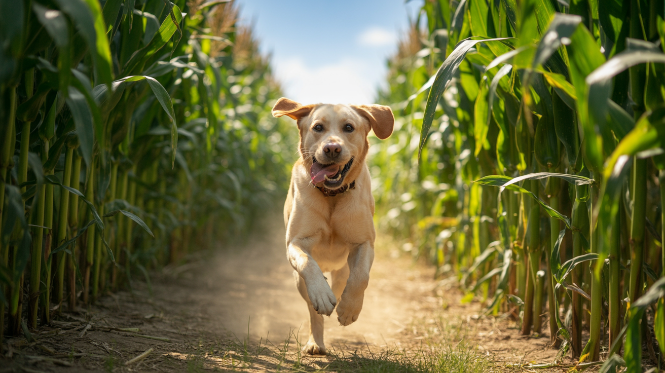 Make a picture of a Labrador dog running through a cornfield in Denmark, sunny day, bright beautiful colors.